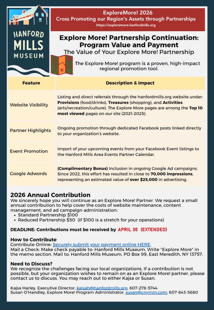 As we plan for the coming year, we are writing to invite you to continue your valuable partnership in the Hanford Mills Museum ExploreMore! regional promotions program for 2026 for Barnyard Swing.